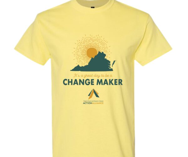 A butter yellow shirt with the silhouette of Virginia in green with a gold sun rising behind it. The gold and green text underneath reads “It’s a great day to be a change maker.” Under the text is the Action Alliance logo.